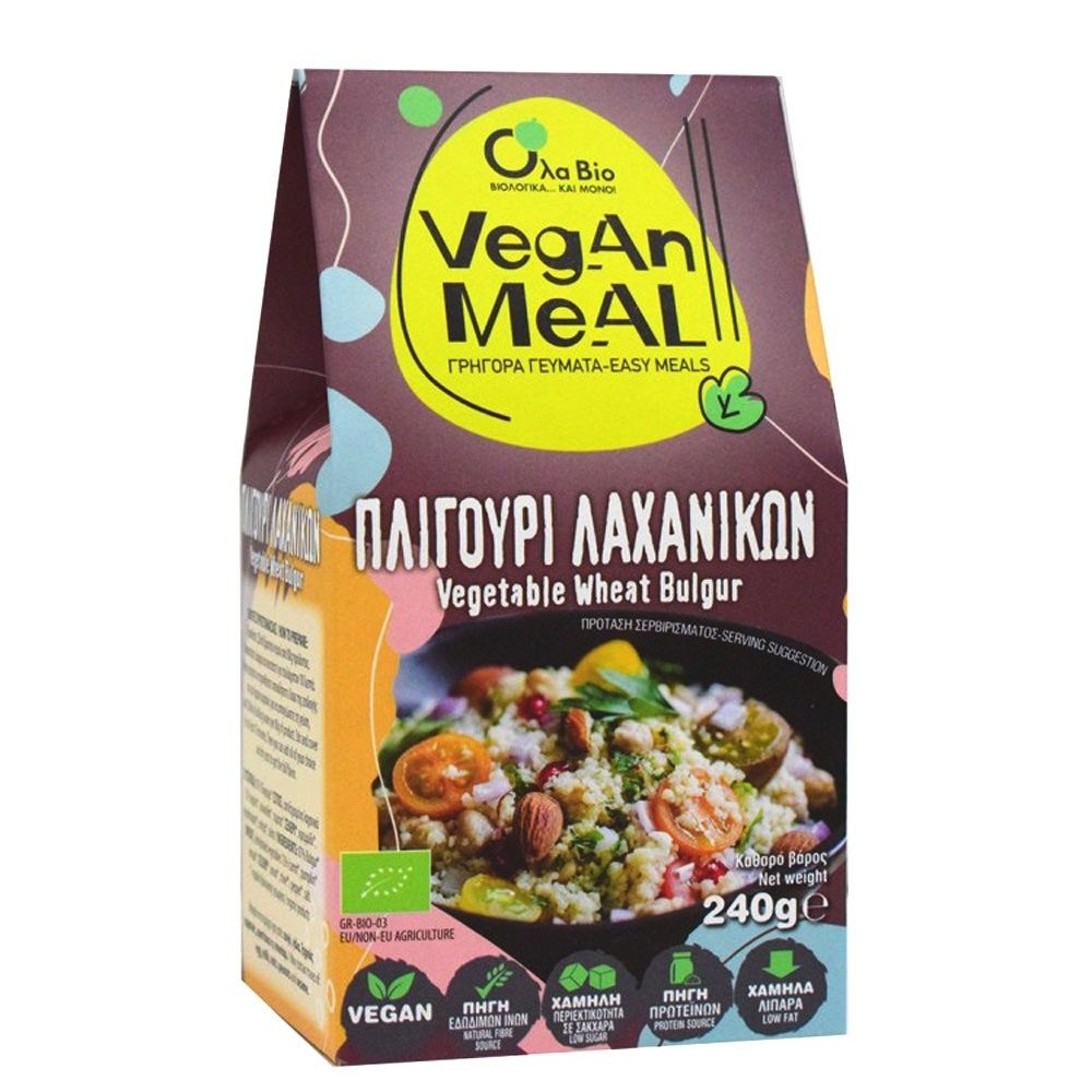Σειρά γρήγορων γευμάτων Vegan Meal της Όλα Bio, προσφέρει μέσα σε 10 λεπτά ένα έτοιμο και πλήρες γεύμα. Ο συνδυασμός αποξηραμένων λαχανικών όπως καρότο, κολοκύθα, τομάτα, κρεμμύδι και σχοινόπρασσο με το πληγούρι εξασφαλίζει ένα χορταστικό γεύμα.